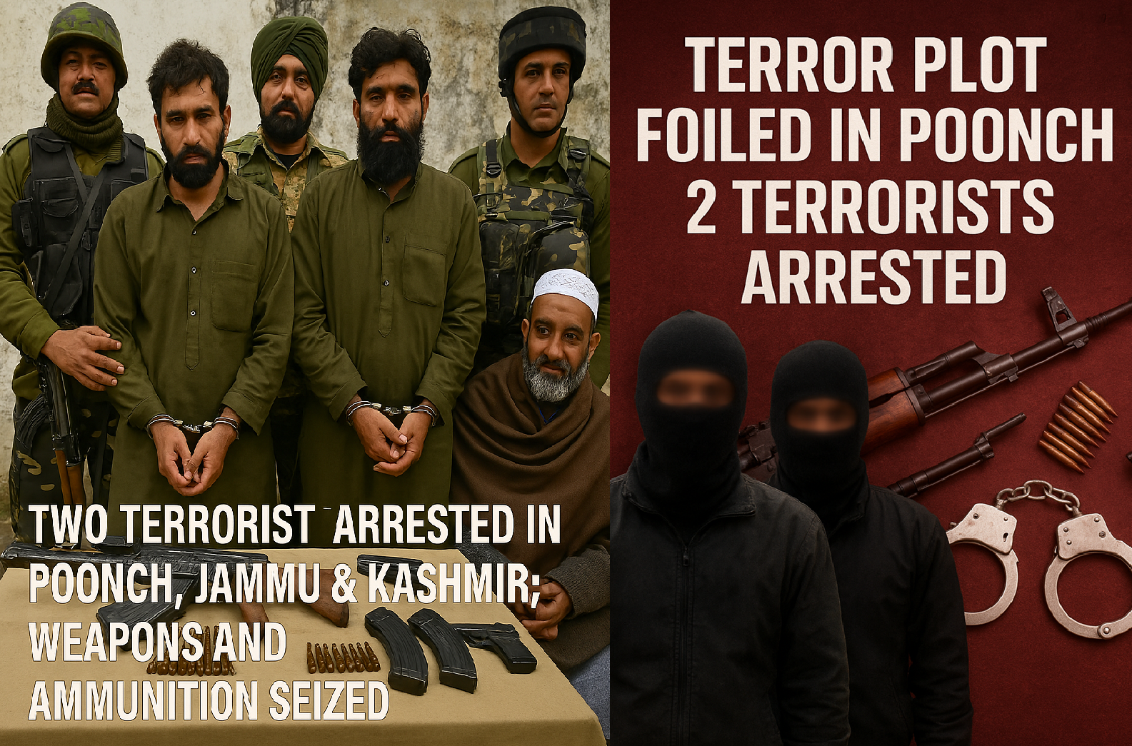 Jammu & Kashmir Police arrested two terrorists in Poonch, foiling a major terror plot. A huge cache of weapons, including assault rifles and ammunition recovered during raids.